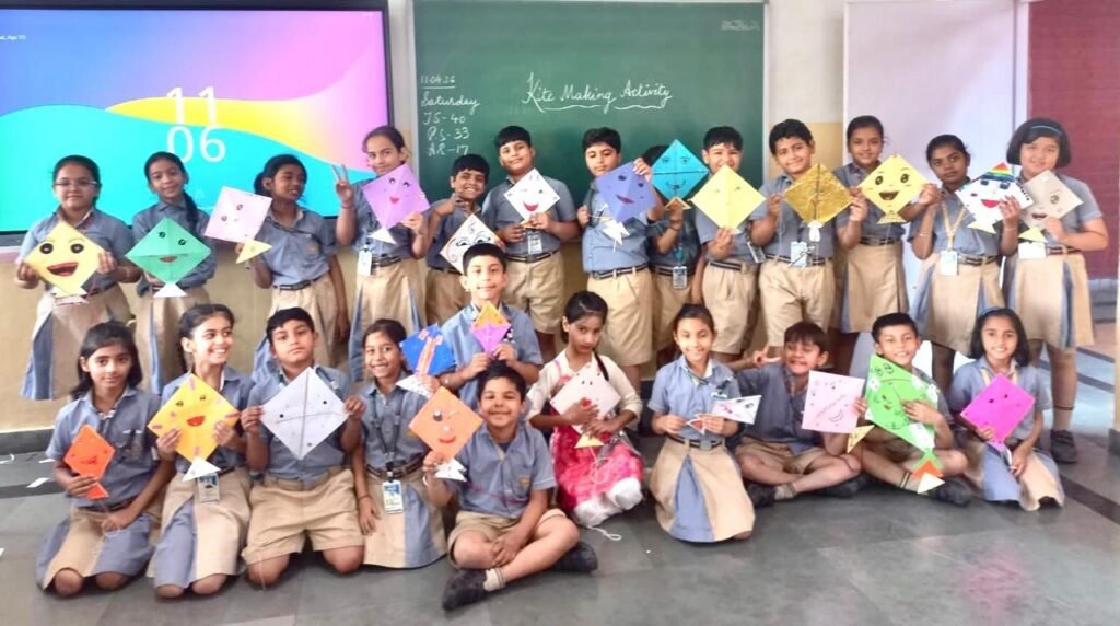 Nursery students explored their creativity through corn craft finger printing, while KG students made colourful kites. Classes I and II enjoyed activities such as pinwheel making and sun paper cutting. Classes III to V participated in engaging tasks including greeting card making, kite designing, creating Phulkari patterns, and a quiz based on the video.