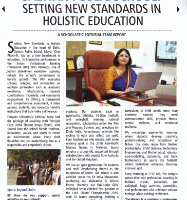 The Annual Sports Day at Salwan Public School, Mayur Vihar, held on 09 March 2025, was a spirited celebration of athleticism, determination, and unity. Titled ‘Glorious Strides – A Celebration of Spirit and Skill’, the event saw enthusiastic participation from over 600 pupils of Classes III to VIII. The occasion was graced by the Chief Guest, Ms Asha Agarwal, Arjuna Awardee and former long-distance runner. Distinguished dignitaries from Salwan Education Trust, school leadership, and parents also attended.