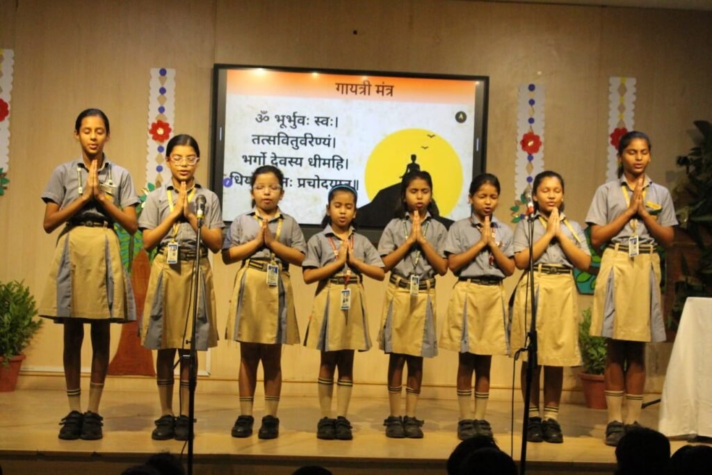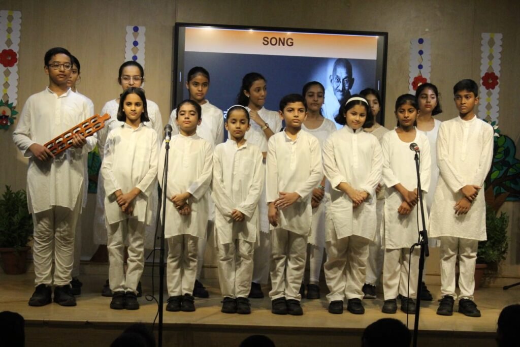 The programme began with a warm welcome by the student anchors, followed by the chanting of the Gayatri Mantra with its meaning by students of Classes IV–VI. This was succeeded by a soulful rendition of the bhajan ‘Vaishnav Jan To’ by students of Classes IV–VIII, evoking Gandhiji’s ideals of compassion and humanity.