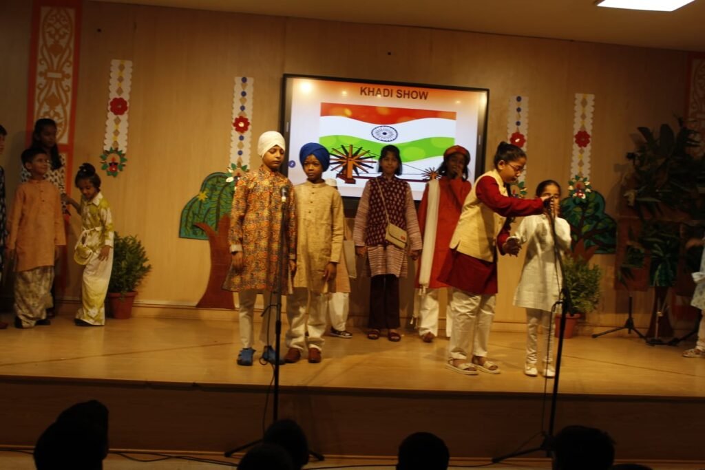 A highlight of the assembly was the Khadi Show, accompanied by instrumental music, presented by students of the Primary Wing (I–V). The graceful walk of students adorned in khadi symbolised Gandhiji’s vision of simplicity, self-reliance, and dignity of labour, reinforcing the message of Swadeshi, sustainability, and pride in indigenous fabric.