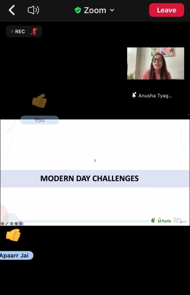 Ms. Anusha Tyagi from Fortis Hospital conducted the session and highlighted the importance of recognising early signs of mental health issues such as social withdrawal, irritability, mood swings, low confidence, fatigue, and disturbed sleep patterns. She advised parents to maintain a positive approach, encourage open communication, and ensure responsible media usage by children. Emphasis was also laid on digital detox, self-care, and seeking timely professional help.
