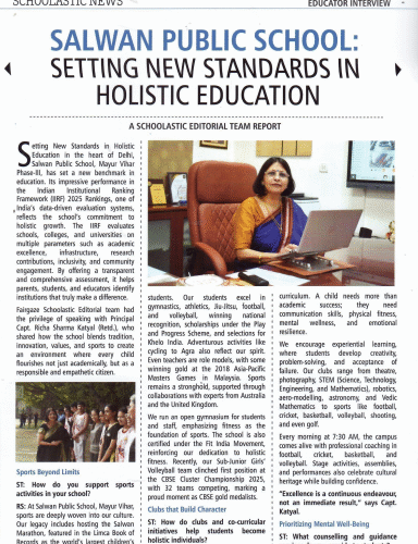 The interview of the School Principal, Capt Richa Sharma Katyal was recently featured in FairGaze Scholastic Magazine, where she highlighted how sports, activity clubs, and student leadership platforms are deeply rooted in the school’s culture. She spoke about prioritising mental well-being through structured wellness initiatives and a supportive environment for every learner.